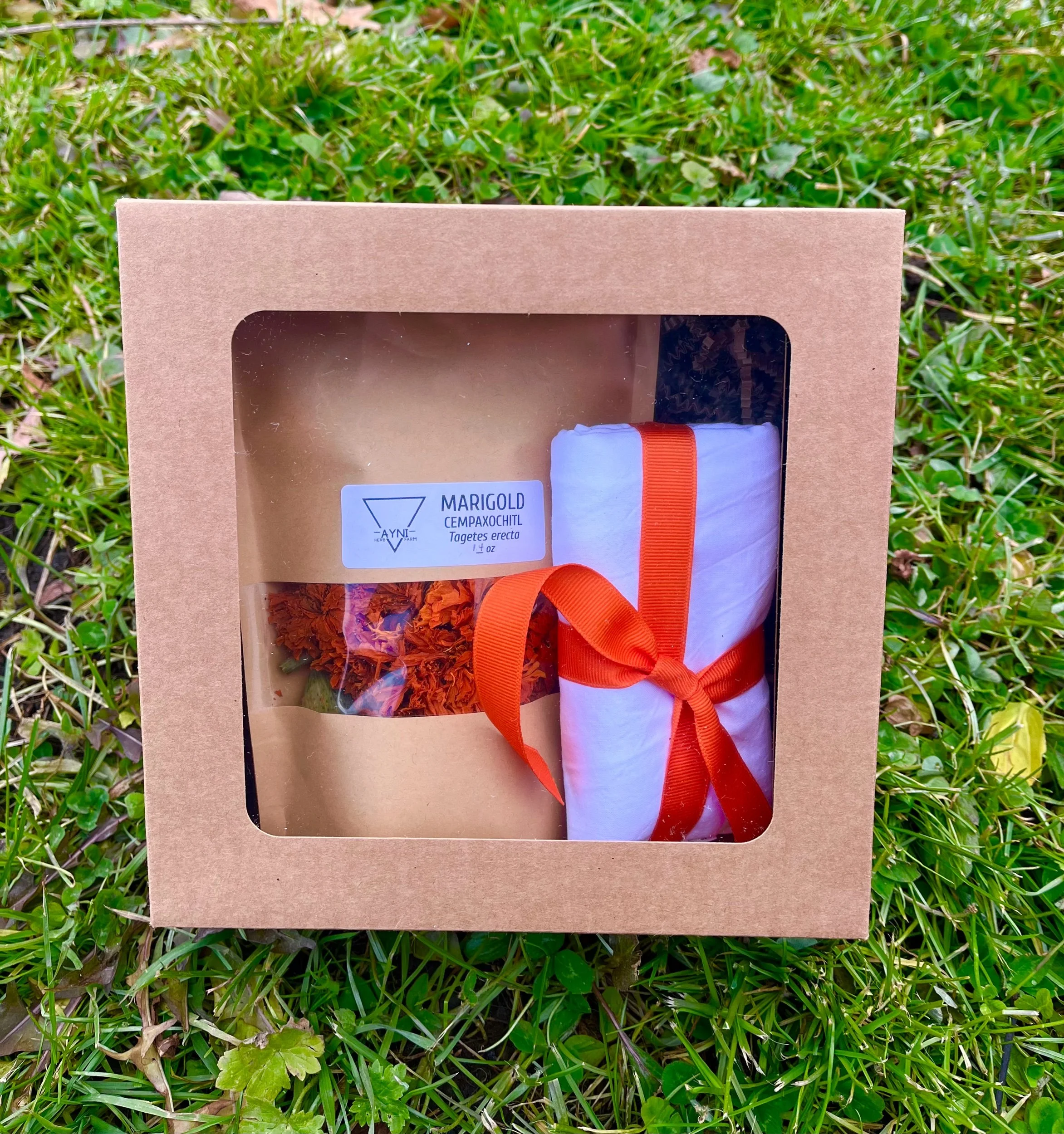 The Marigold Dye Kit is a perfect gift for anyone interested in infusing color from plants into your wardrobe! This kit includes dried marigolds full of vibrant orange tones and two mordanted cotton bandanas that are ready to take on color beautifully.